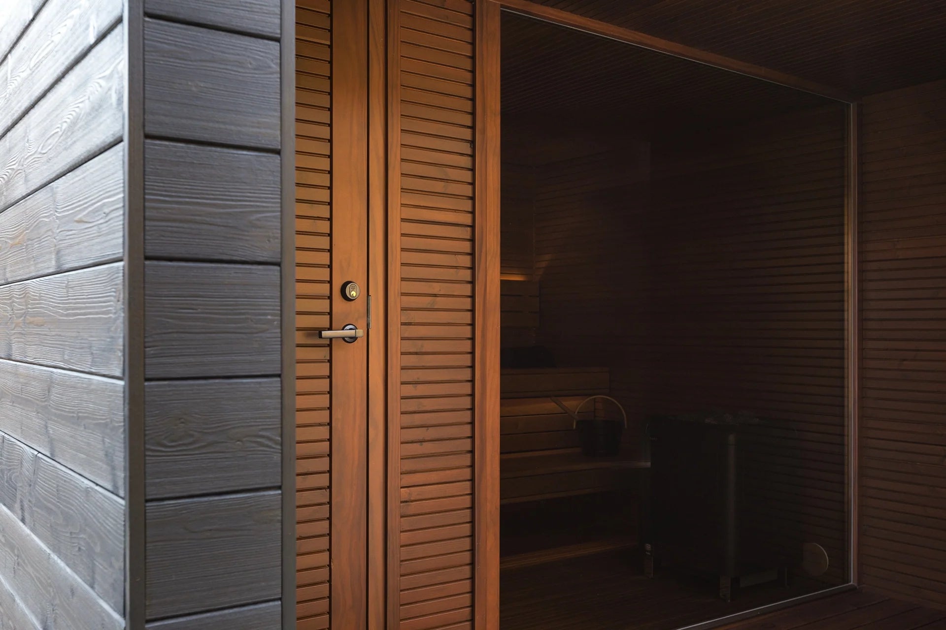 Dedicated changing room with a comfortable bench and tempered glass door to keep heat inside the sauna.