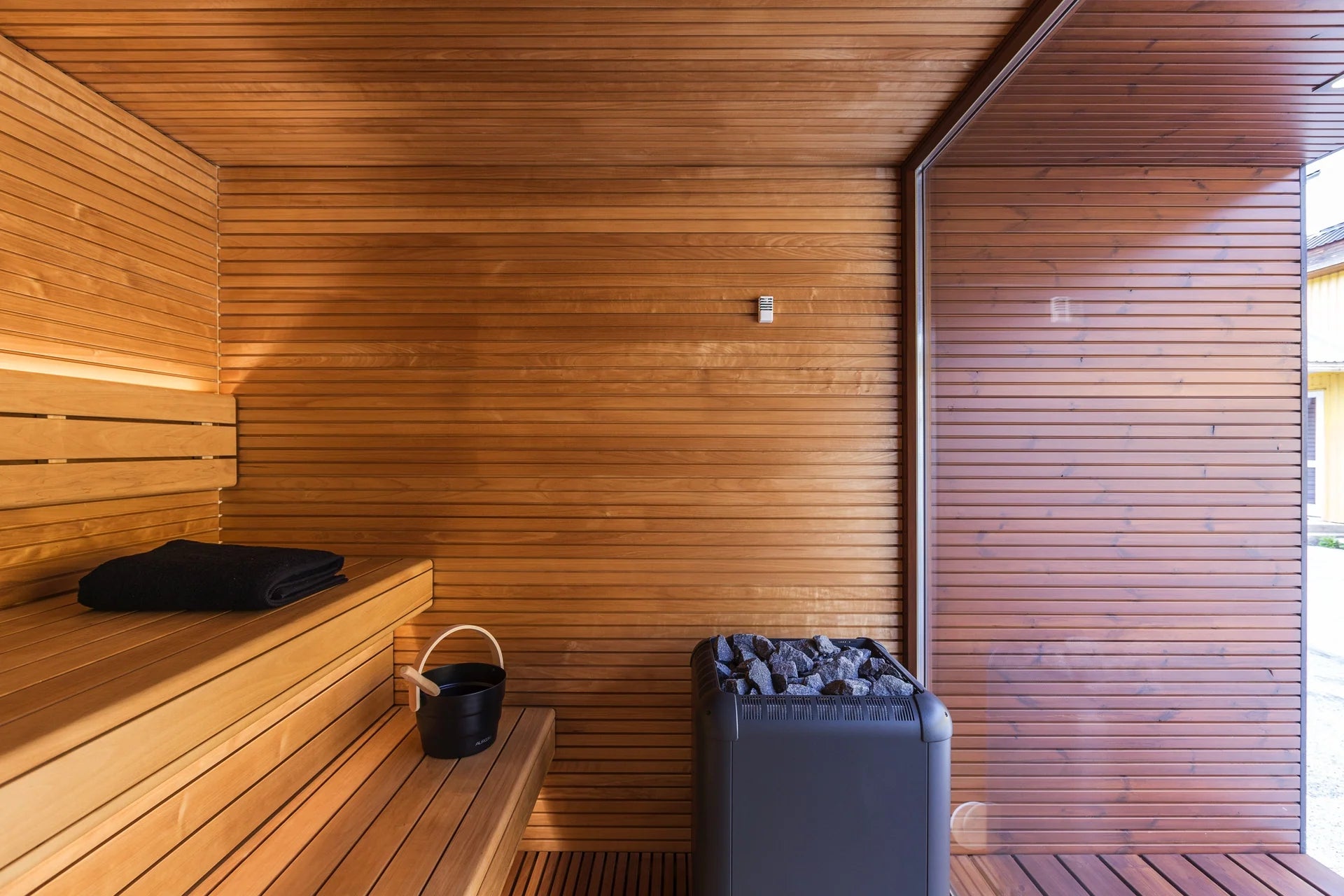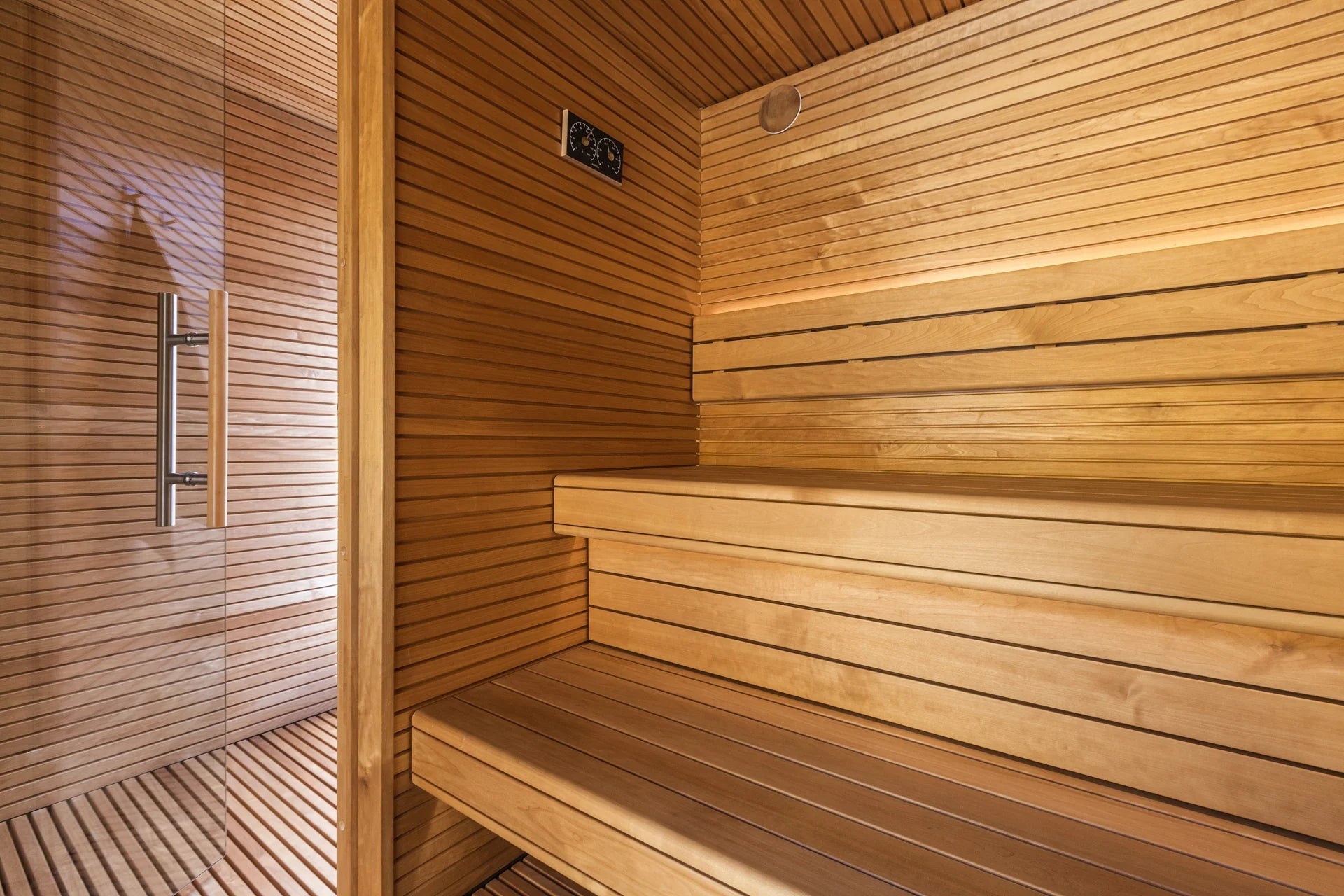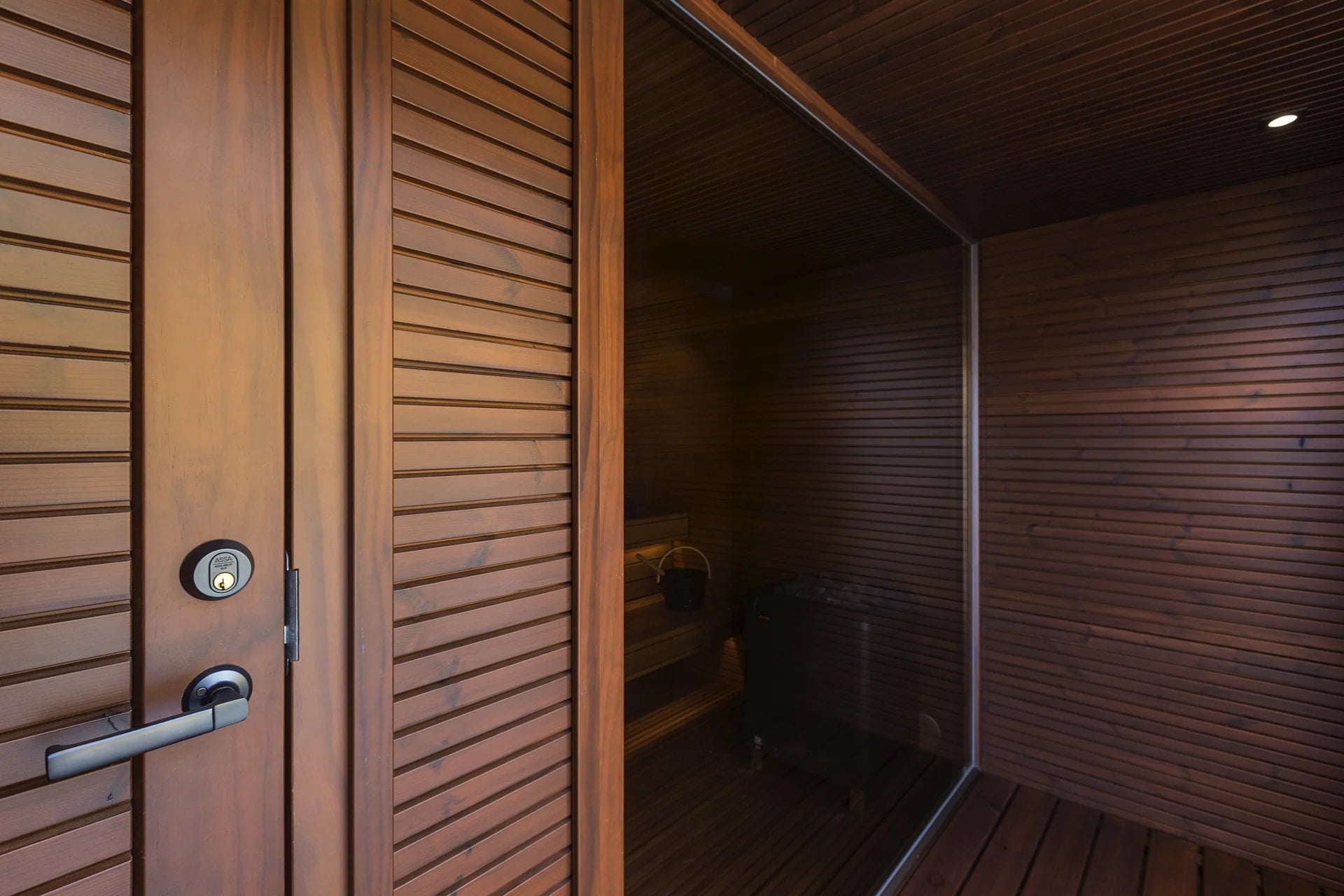 Interior: Luxurious Thermo-Aspen in Rombto profile (27x90 mm), heat-treated for superior stability and a smooth, refined surface.