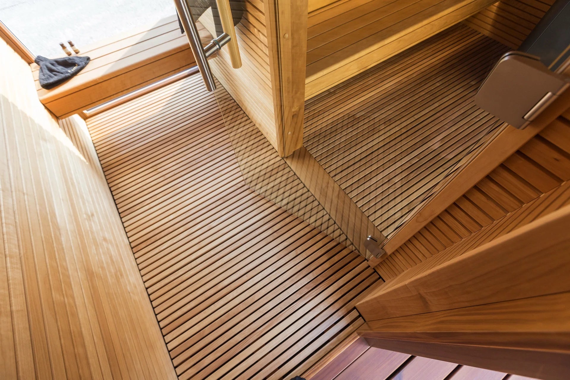 Built-in drainage system for the sauna floor to ensure cleanliness and durability.
