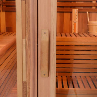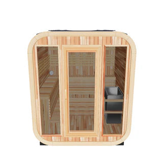 Included Accessories: 8 mm tempered glass door, wooden spoon & barrel, explosion-proof lamp, 2 bags of lava stones, thermo-hygrometer, hourglass, two red cedar backrests, outdoor waterproof tiles